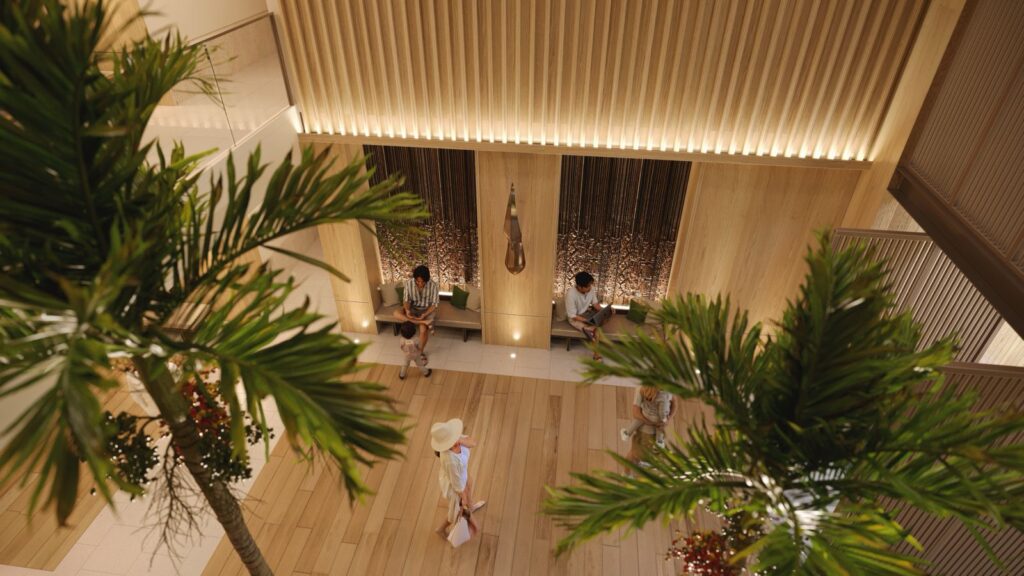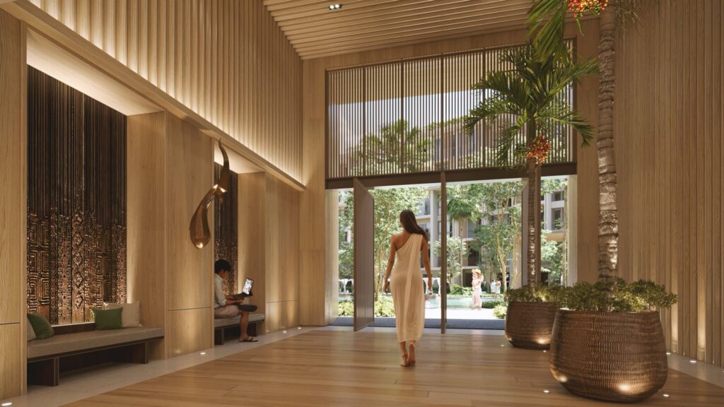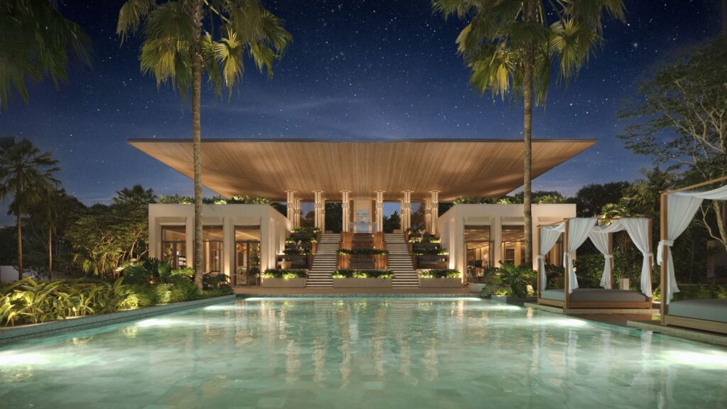 Архитектура проекта сочетает современный минимализм и тропическую эстетику. Внутренние пространства оформлены в светлых, естественных тонах с панорамными окнами, создающими атмосферу простора и уюта.
