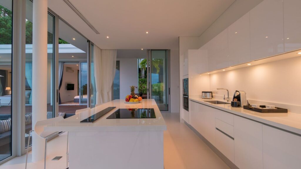 В гостиной зоне открытой планировки находятся кухня европейского типа с барной стойкой, столовая на 10 персон и лаунж с мягкими диванами. На террасе у бассейна расположены шезлонги, встроенная зона отдыха и небольшой газон для игр на свежем воздухе.