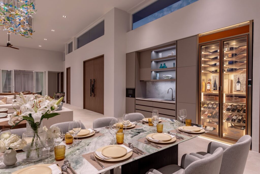 Восемь спален, включая четыре мастер-сьюта, оформлены с применением натуральных материалов, мягких тканей и дизайнерских элементов. Каждая спальня оснащена Smart TV, кондиционером, сейфом и ванной комнатой с тропическим душем и панорамной ванной.