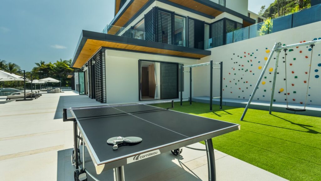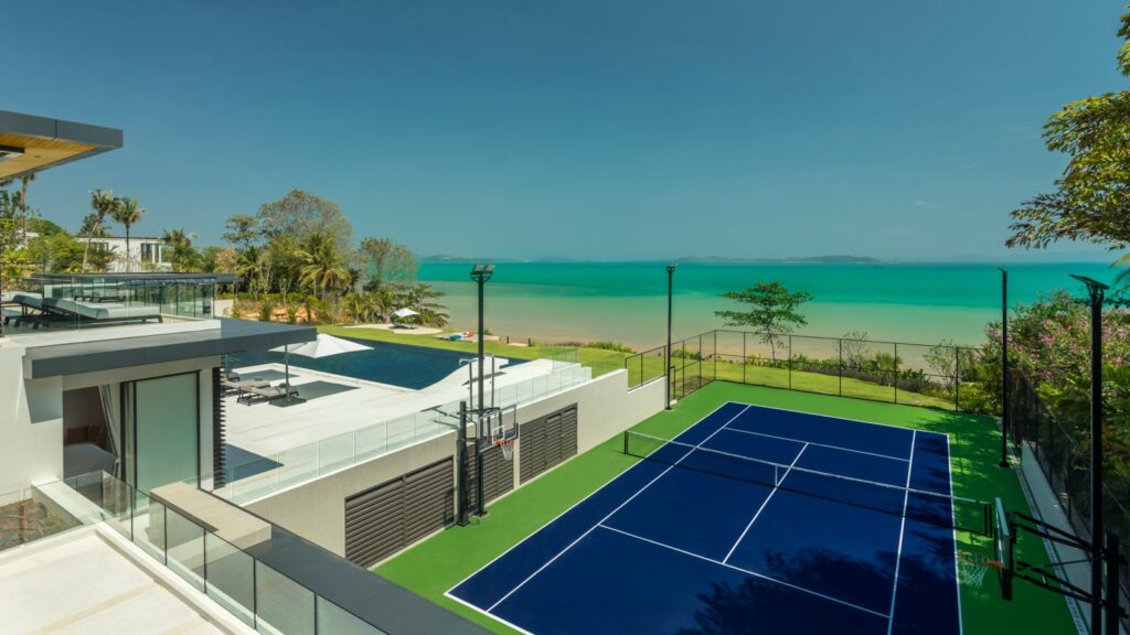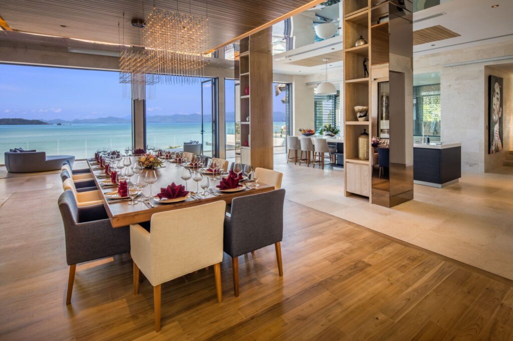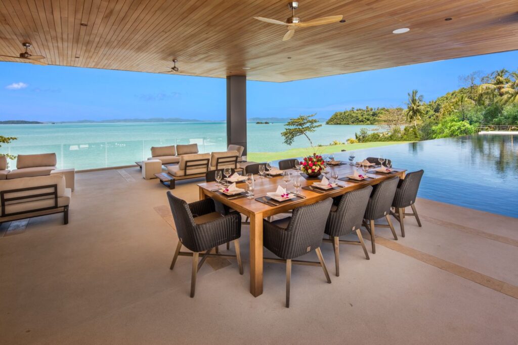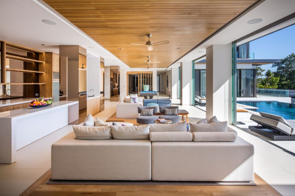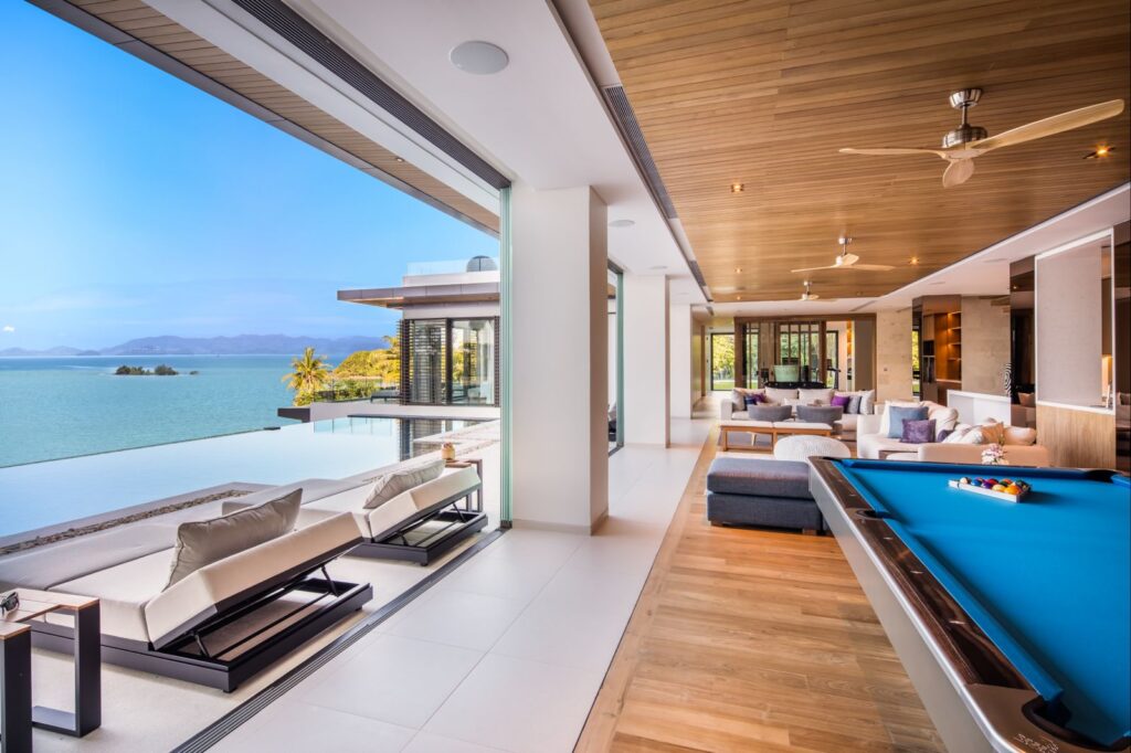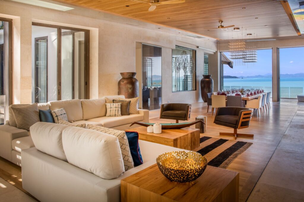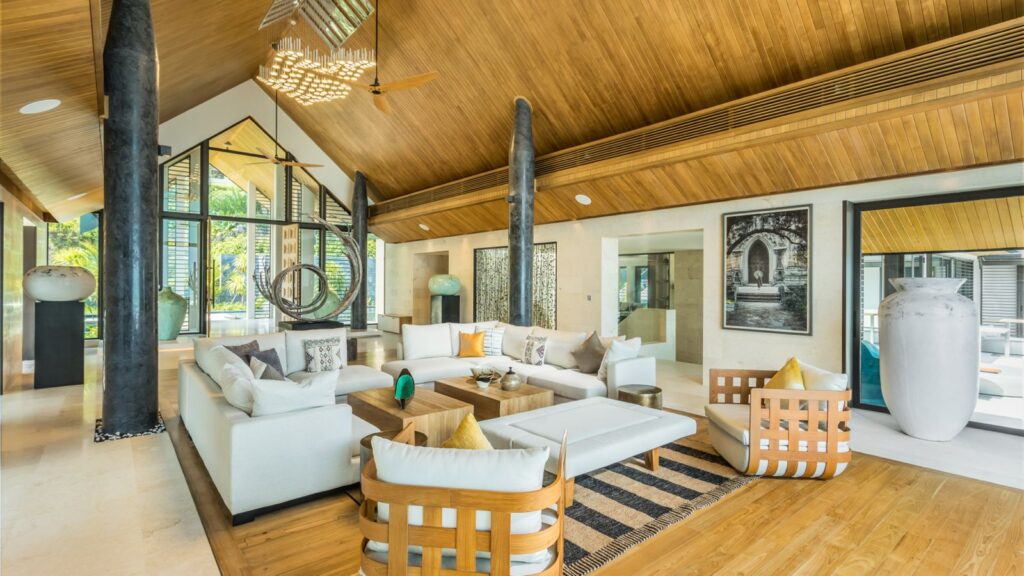 Площадь виллы составляет 4 000 кв. м, а земельного участка — 8 000 кв. м. Интерьеры выполнены в современном тайском стиле с элементами ар-деко, панорамными окнами и высокими потолками.